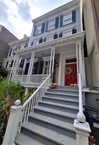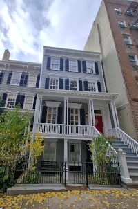 Celle du numéro 122 est la plus ancienne. Cette charmante demeure fut construite en 1859 par Adam C. Flanagan. En 1871, cet employé des douanes vendit le terrain adjacent qu'il possédait à John Rennert. Ce négociant en vins commanda alors la maison numéro 120. Peu après, un décret de la ville interdit la construction des habitations en bois jugées trop dangereuses en cas d'incendie. |