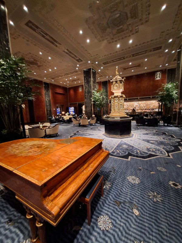 Franchissez la porte ! Sur le sol, une magnifique mosaïque s'offre à vos yeux. Au centre du hall trône la "Pendule" du Waldorf-Astoria appelée l'Horloge de l'Exposition Universelle de 1893 . Elle sert de point de rencontre avec l'expression "Meet me at the Clock". Un piano sur lequel joua Cole Porter est juste à côté. Les pieds des chaises alignées devant le bar, quant à eux, forment une étrange colonnade. Avant de consommer un cocktail ou un expresso , il est recommandé de consulter la liste des prix sur place puisqu'ils ne sont pas publiés sur internet. EXIT.