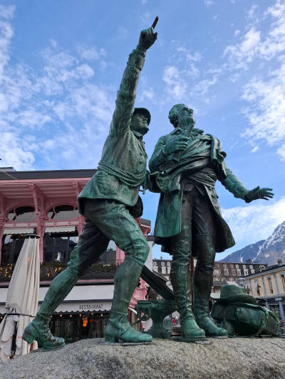 De retour en ville, les nombreuses statues de Jacques Balmat et du docteur Michel Paccard rappellent l'exploit de ces deux hommes qui sont parvenu au sommet de cette montagne le 8 août 1786. Suivi à la longue-vue par une bonne partie de la population, ils furent accueillis en héros lors de leur retour.