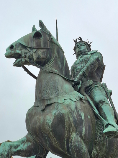 Sur la place du Marché de Dinan trône la statue de Bertrand du Guesclin (1320-1380). Sa notoriété divise : héros libérateur pendant la Guerre de cent ans pour les Français ou traître par les nationalistes bretons qui lui reprochent d'avoir fait marcher les troupes du Roi de France sur celles du Duché de Bretagne. Mais qu'importe !